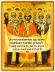 The iconographic scheme followed is the usual Athonite one, which, on the basis of the extant examples, seems to have been created on Mount Athos. The model for this scheme, with its frontal standing saints, is the All Saints' icon, as we know it from manuscript illumination and monumental art (Walter 1991-2, p. 216). The scroll unfurled in front of the figures goes back at least to the early sixteenth century in manuscript miniatures (Vatopedi Cod. no. 483; Thesauroi 1991, pp. 248-9, figs. 27-8), although even in Byzantine times occur representations of Ecumenical Councils with the Church Fathers standing and holding open scrolls (Orlandos 1970, pp. 243-53, pl. 24).
