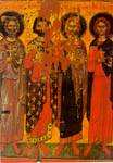 On the main face of this double-sided icon, which has been reduced down both sides, are the founder of Dionysiou Monastery, Alexios III Comnenos (1350-90), and John the Baptist, to whom the monastery is consecrated. Alexios, Emperor of Trebizond, is portrayed on the left, standing in a frontal pose, dressed in royal attire, and wearing a crown with pearl-studded pendants. In his right hand he holds a sceptre with a cross, in his left a model of a domed church. St John the Baptist is shown full-length on the right, standing on rocky ground. He wears a bluish sheepskin with an olive-green himation on top. In his left hand he holds a closed scroll and a cross on a staff, and in his right a model of the church. Above the model is the seated Christ in glory, making a gesture of blessing with his right hand and holding a closed Gospel in his left. The Emperor is accompanied by the following inscription, in red capitals on a gold ground: ''ΑΛΕΞΙΟΣ ΕΝ Χ(ΡΙΣΤ)Ω ΤΩ Θ(Ε)Ω ΠΙΣΤΟΣ ΒΑΣΙΛΕ[Υ]Σ / ΚΑΙ ΑΥΤΟΚΡΑΤΩΡ ΠΑΣΗΣ ΑΝΑΤΟΛ[ΗΣ] [Ι]ΒΗΡ[Ω]Ν / ΚΑΙ ΠΕΡΑΤΕΙΑΣ Ο ΜΕΓΑΣ ΚΟΜΝΗΝΟΣ / Κ(ΑΙ) ΚΤΗΤΩΡ ΤΗΣ ΜΟΝΗΣ ΤΟΥ ΤΙ/ΜΙΟΥ ΠΡΟΔΡΟΜΟΥ'' (Alexios in Christ our God, faithful King and Emperor of all the East, Georgia, and all lands beyond, the great Comnene and founder of the Monastery of the Holy Prodrome). The Emperor is a close copy of the portrait of Alexios Comnenos which accompanies the chrysobull he issued in 1374-5 concerning the foundation and endowment of the monastery (Doelger - Weigand 1943, p. 97. Actes de Dionysiou 1968, pp. 50-61. Kadas 1979, fig. 124.). The chrysobull is still treasured in the monastery as part of its precious heritage. The close resemblance between the icon and the chrysobull means either that the same artist painted both the miniature and the icon or that the artist who painted the icon copied the portrait of Alexios on the chrysobull, where he is depicted with his consort Theodora. On the reverse of the icon, on an orange ground that imitates gold, are four saints from Trebizond: Canidios, Eugenios, Valerian, and Acylas. The full-length saints stand in frontal poses, wearing sleeved tunics and cloaks, each holding the cross of his martyrdom in his left hand. St Eugenios is discreetly distinguished by the fact that his cross is on a staff and his halo is gold, rather than dark blue. He is also accompanied by an inscription attesting his place of origin: 'The Trapezuntine'. The depiction of Emperor Alexios Comnenos as founder of the monastery on the main face of the icon just as he is portrayed on the chrysoboulla concerning the founding of the monastery (1374-5), together with the depiction of the Trapezuntine saints on the reverse, suggests that both icon and chrysobull may have been painted by the same workshop and that the icon was therefore given to the monastery by the Emperor.
