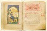 The manuscript is decorated with red rectangular headpieces and red initials with foliate ornamentation, contemporary with the script. The pictures of the three Evangelists, however, that precede their respective Gospels, Matthew (fol. 11v), Mark (fol. 100v) and Luke (fol. 159v) seem to have been taken from another, smaller and older, manuscript.